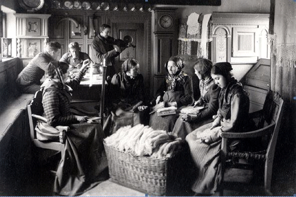 *Illustration: Rekonstruktion af et kartegilde fra Holbæk-egnen. Et kartegilde var en sammenkomst, hvor landsbyens unge piger hjalp en husmoder med kartningen og bagefter blev trakteret. (Foto: Søren Bay. Omkring 1900. Dansk Folkemindesamling, Det Kongelige Bibliotek)